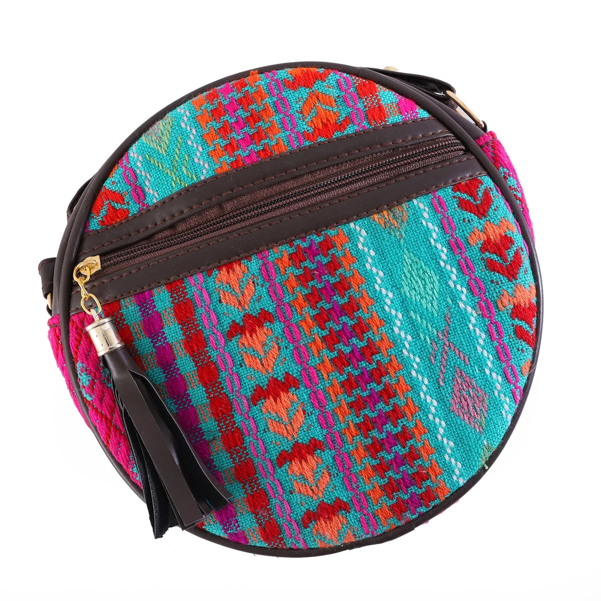 Petite in size, rich in texture. This round sling bag blends vibrant jacquard fabric with structured vegan leather for a look that’s playful yet polished. Designed for light days, quick errands, or hands-free evenings, it’s the bag you throw on when you want to travel light—but look intentional. The bold woven pattern brings instant texture to any outfit, while the round silhouette keeps things modern and fresh. Two interior pockets keep essentials organized, and a durable zip closure ensures everything stays in place.